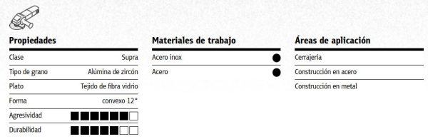 • con diversas granulometrías. Por este motivo es apropiado para todas las amoladoras angulares convencionales, así como para múltiples aplicaciones. ### Discos de láminas abrasivos Supra para un alto rendimiento Los discos de láminas abrasivos de la línea de productos «Supra» destacan por su larga vida útil, además de su tasa de remoción. Por este motivo son ideales para el uso profesional, así como para altas exigencias en el ámbito del bricolaje. Las prestaciones del disco de láminas abrasivo SMT 624 Supra están garantizadas por el grano robusto de alúmina de zircón que ofrece un alto rendimiento. El material es autoafilante, dado que surgen continuamente nuevos cantos afilados durante el proceso de lijado. Con su resistencia extrema, el plato hecho de robusto tejido de fibra de vidrio cumple un elevado estándar de seguridad. En función del diámetro de. disco, la velocidad de giro admisible es de hasta 15.300 vueltas por minuto. Cuanto más grande sea el disco de láminas abrasivo, más baja es la velocidad de giro admisible. Una inscripción en el disco indica el margen de revoluciones permitido en cada caso.