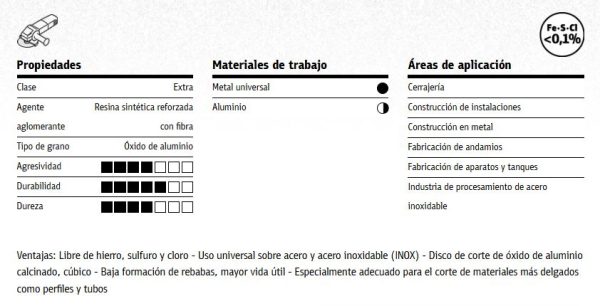 Ventajas: Libre de hierro, sulfuro y cloro – Uso universal sobre acero y acero inoxidable (INOX) – Disco de corte de óxido de aluminio calcinado, cúbico – Baja formación de rebabas, mayor vida útil – Especialmente adecuado para el corte de materiales más delgados como perfiles y tubos