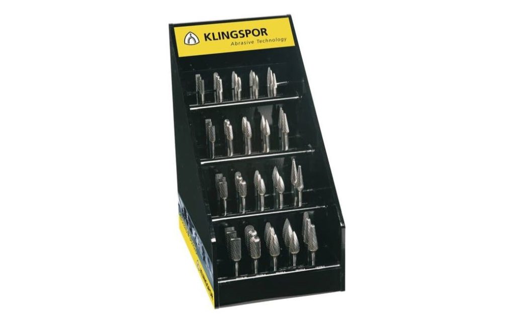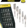 El juego de fresas de 40 piezas de Klingspor contiene fresas en todas las formas y tamaños usuales. Dispuestos de manera ordenadas en una caja de presentación con cerradura, cada fresa de metal duro está inmediatamente a mano. El juego de fresas comprende dos fresas de metal duro de cada una de las siguientes formas: