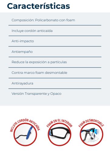 Lentes con propiedades antifatiga, utilizados como protección primaria. El PU foam en el interior permite el trabajo en áreas con partículas sólidas en suspensiones, ofreciendo la versatilidad de ser desmontable, siendo muy resistente y cómodo. Aptos para trabajos en exteriores e interiores.