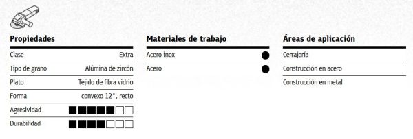 En este producto se utiliza la probada alúmina de zircón como tipo de grano. El plato está fabricado de un resistente tejido de fibra de vidrio de alta calidad. De esta manera, este plato alcanza un efecto extraordinario en amoladoras angulares de todas las clases de potencia. Incluso con una presión de aplicación reducida no se necesita temer su vitrificación. Esto facilita considerablemente el manejo y asegura buenos resultados y superficies de alta calidad. El modelo SMT 324 Extra está disponible con diferentes granulometrías y diámetros. Según el diámetro, la velocidad admisible se encuentra entre 12.200 y 13.300 revoluciones por minuto.